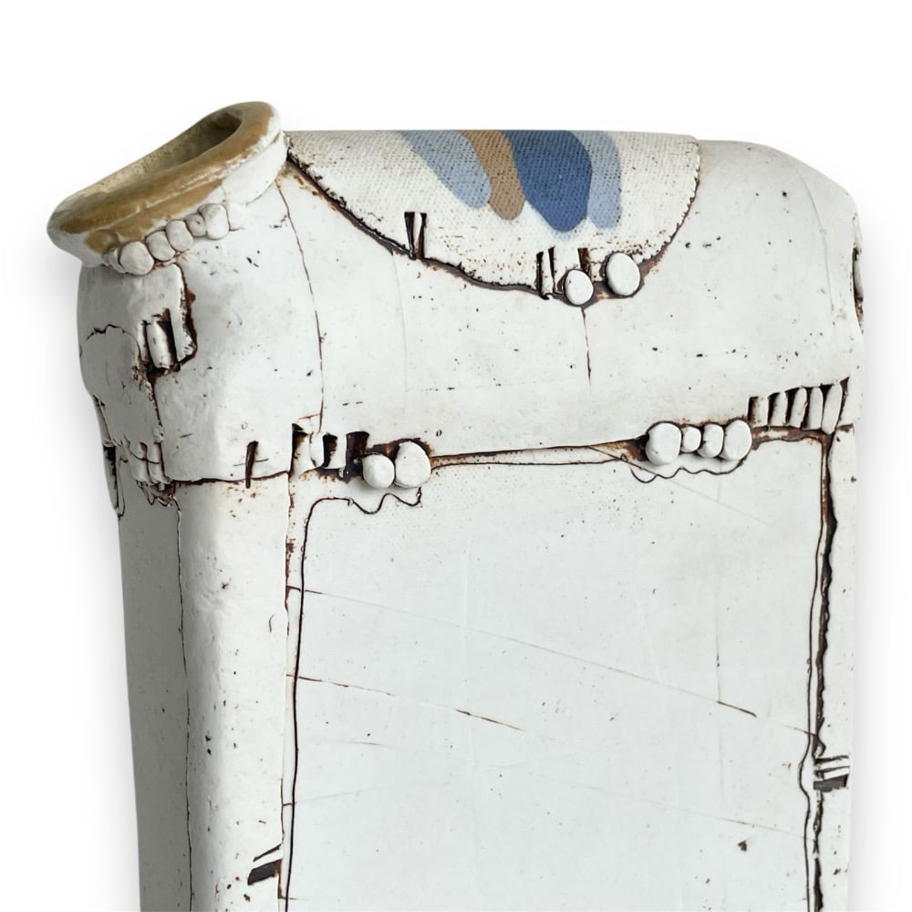 ITEM: vintage studio pottery vase from "The Terry Pottery" in Norwell, Massachusetts, active from the 1970s to the 1980s and created by Ralph and Sandy Terry. Known for their handcrafted pieces, this vase includes incredible details and incised designs. Signature and sticker on the bottom.