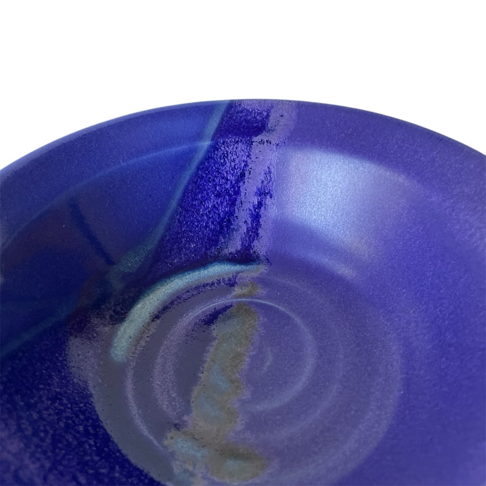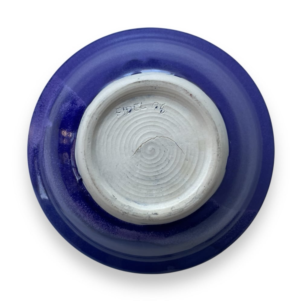 ITEM: handmade bowl with bold indigo glazing. Half semi-gloss purple, and half shiny indigo with hints of turquoise and olive. Signed "Fidel 08" on the bottom.
