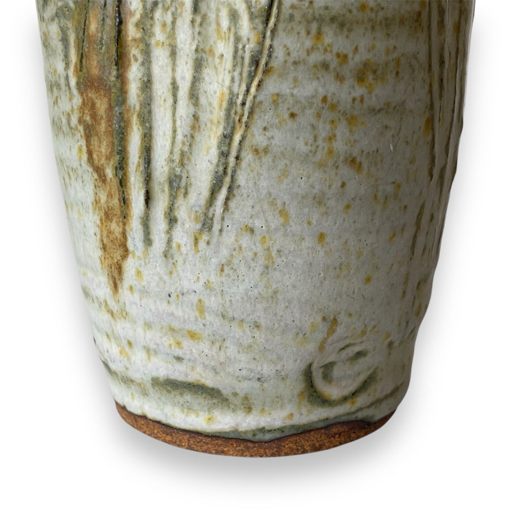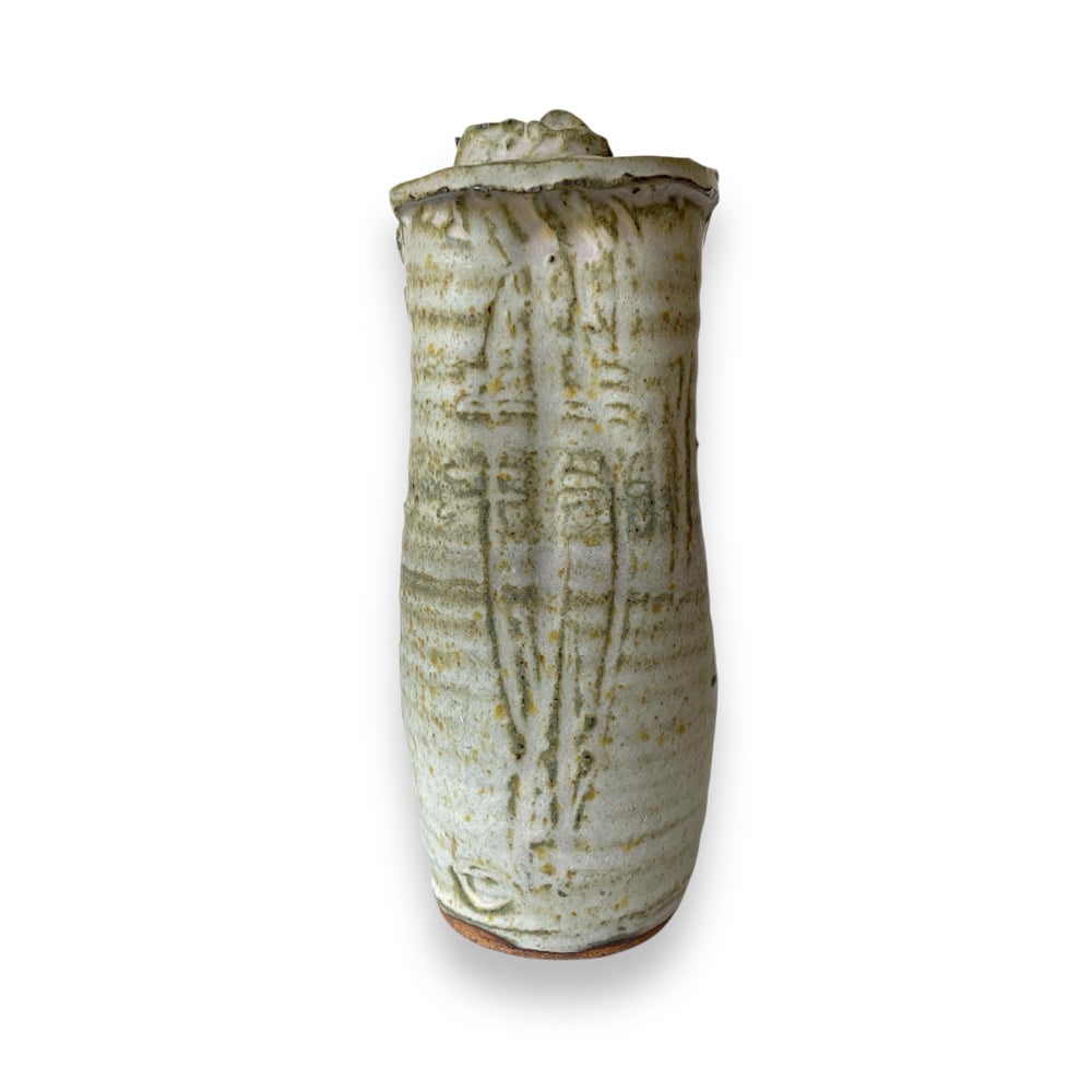 ITEM: vintage studio pottery weed pot style (small opening) vase. This unique piece has textural details and earthy colors. Capped with a flat top and organic mouth opening. There is faint green writing near the bottom on the back side that does not wash off, but is not exceptionally noticeable (see last photo).