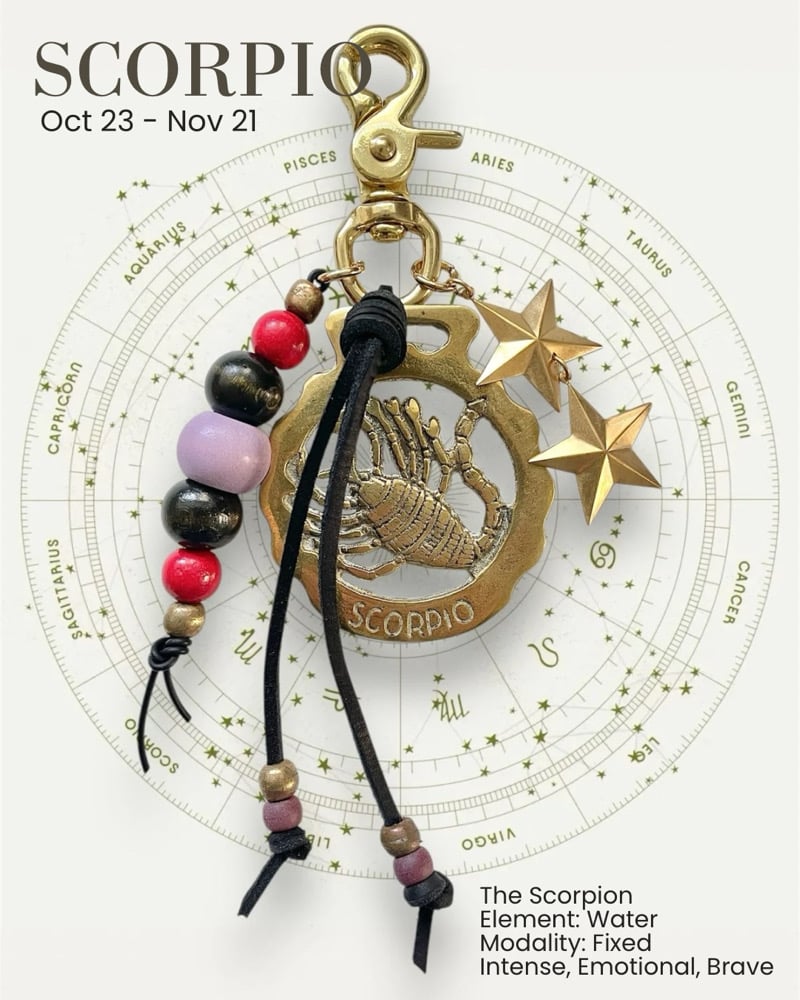 Show off your zodiac personality with a one of a kind bag charm made from vintage objects and color coded to each sign's palette. As unique as you, only one of each sign is available!